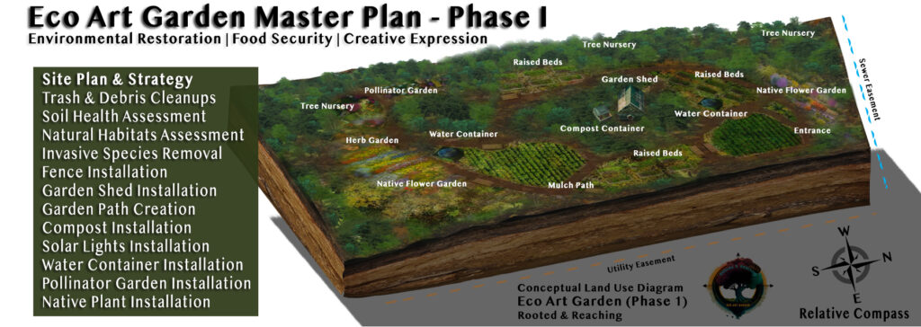 Rooted & Reaching is creating an Eco Art Garden – a sustainable oasis in Kansas City, Missouri that showcases the beauty of nature, permaculture, and creativity. A community development model that explores the power of art and education to promote environmental conservation and sustainable living practices.
